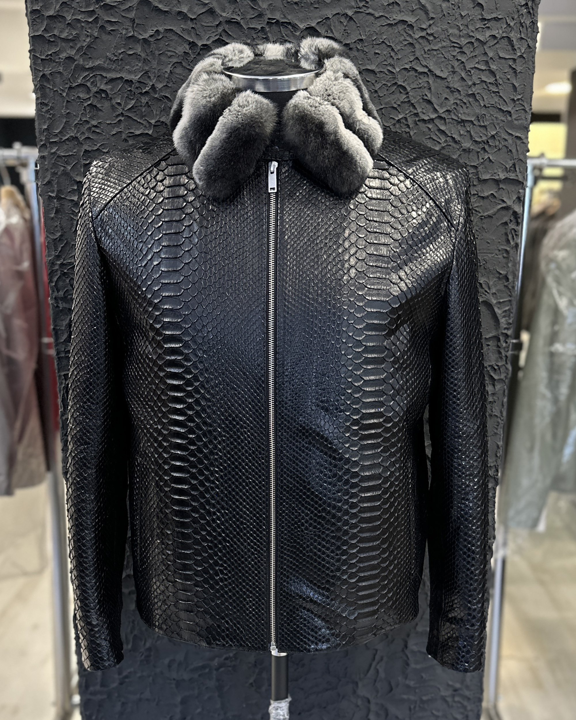 Black Python Leather Fur Collar Jacket