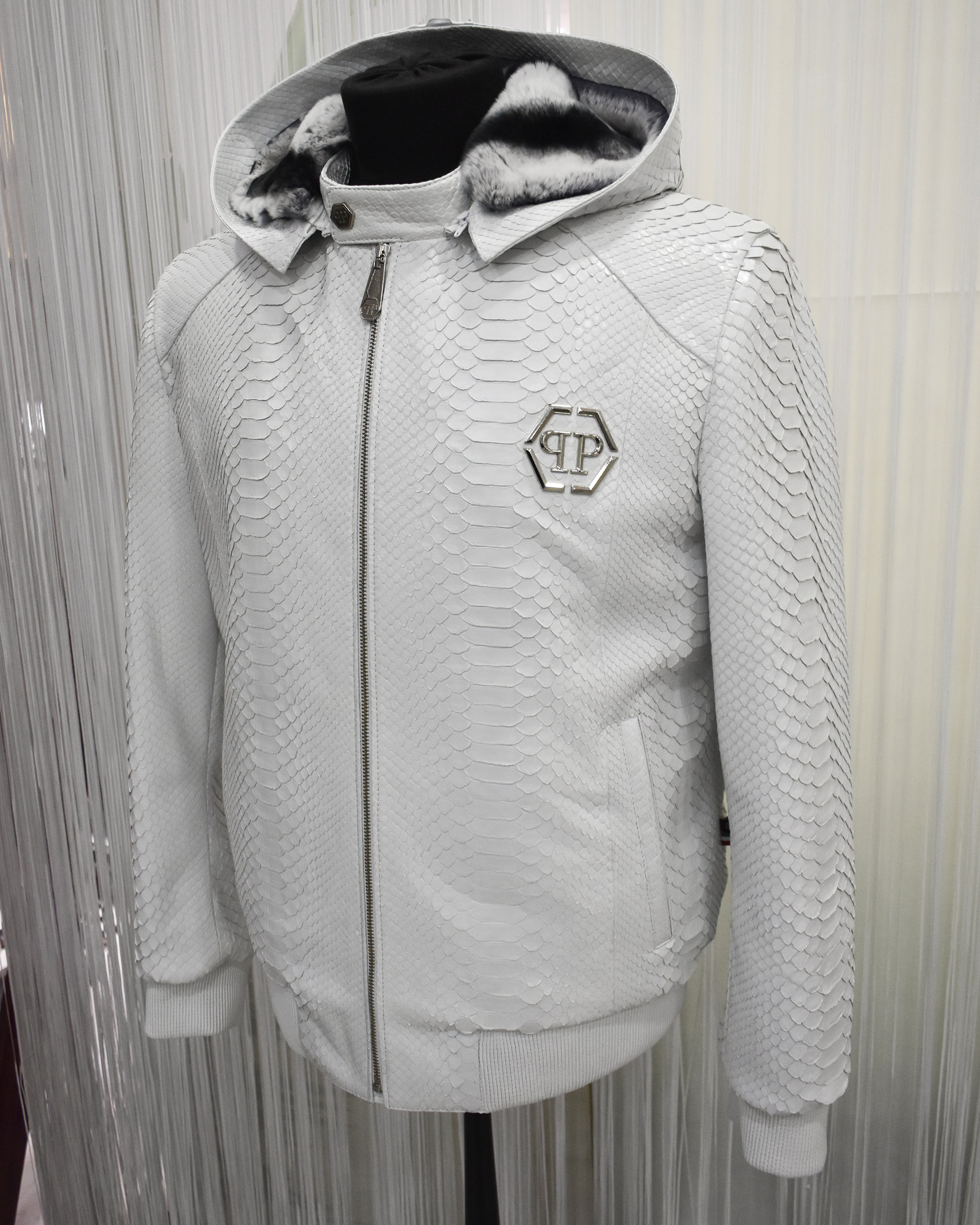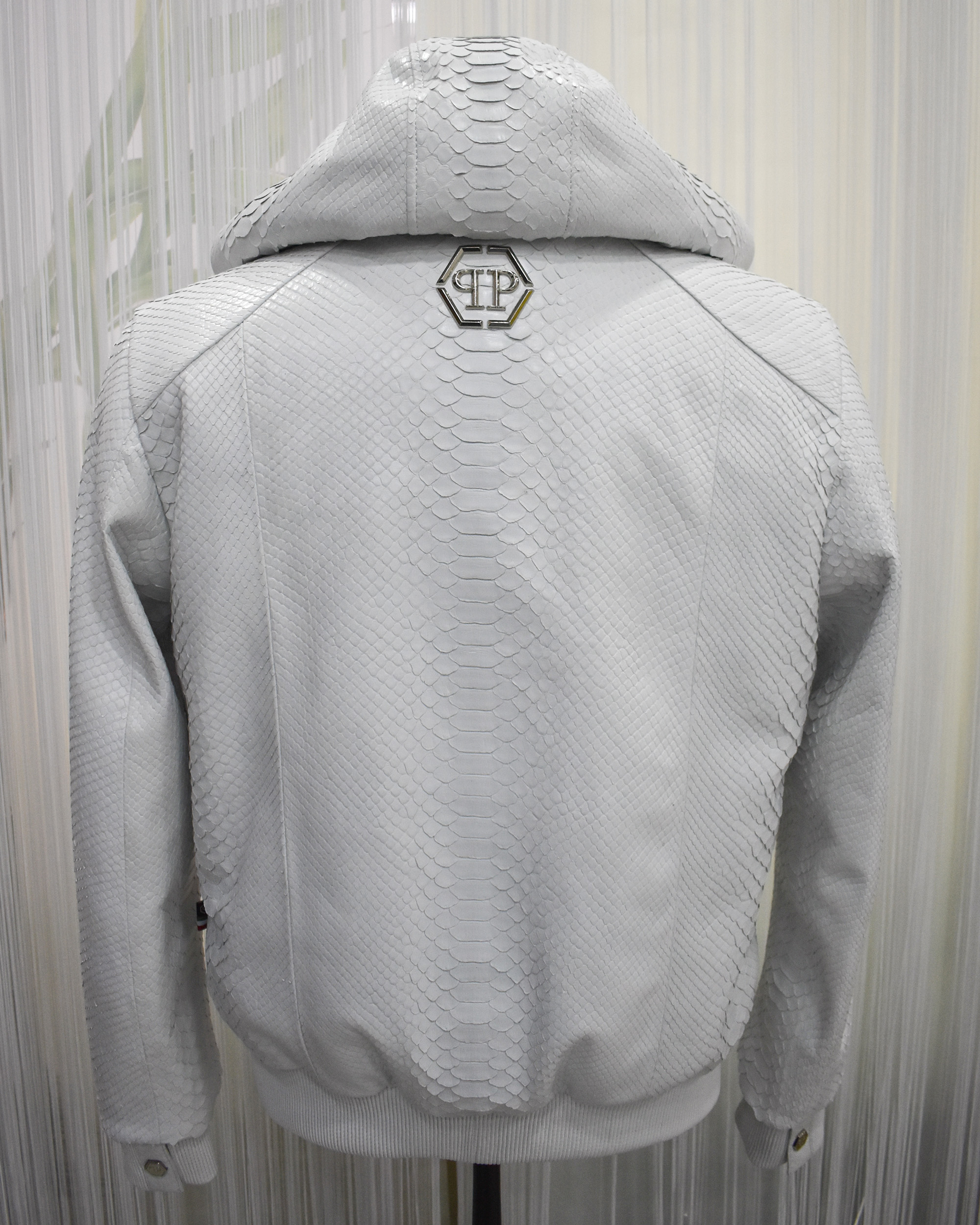Philipp Plein White Python Leather Rex Fur Lining Hoodie Jacket