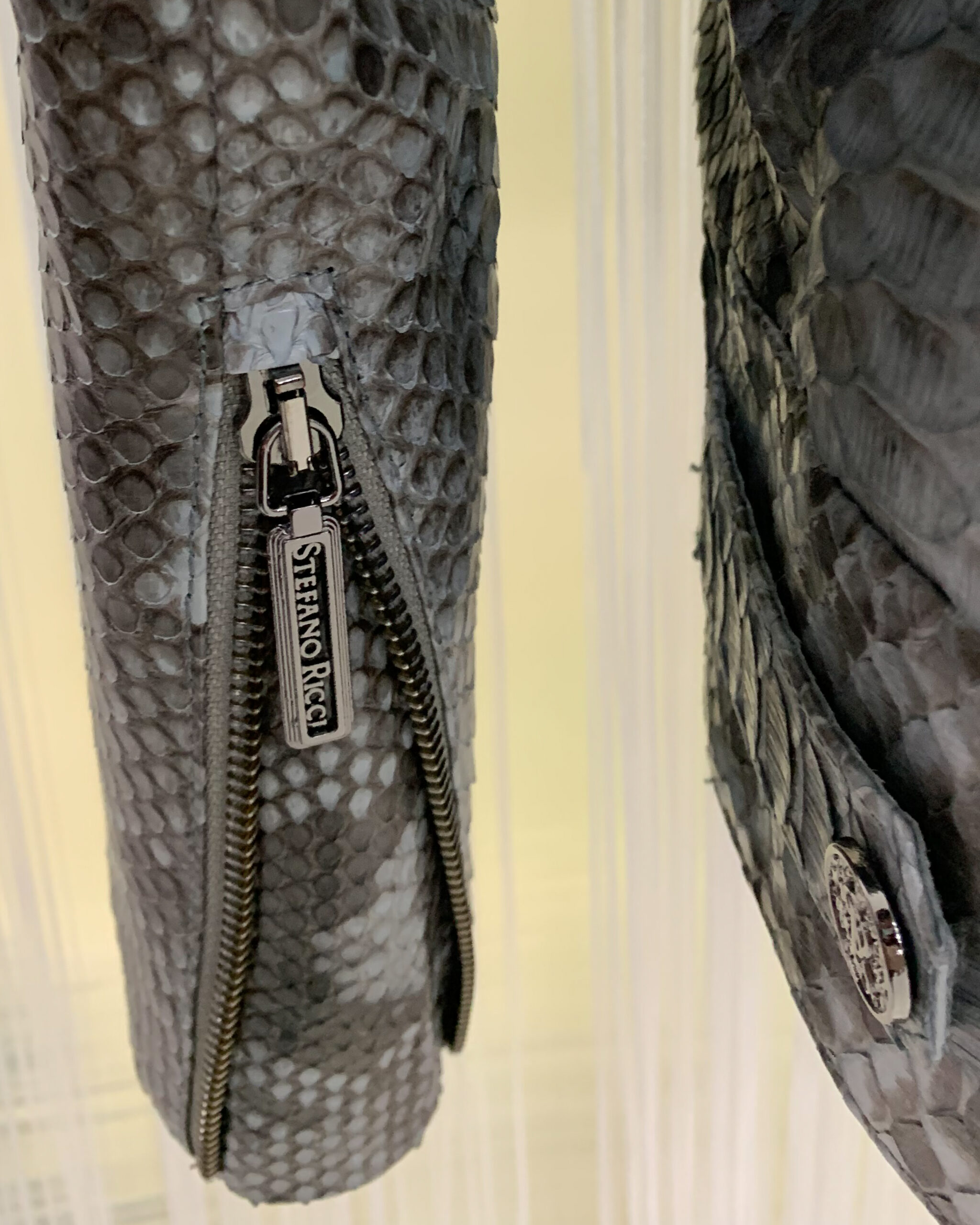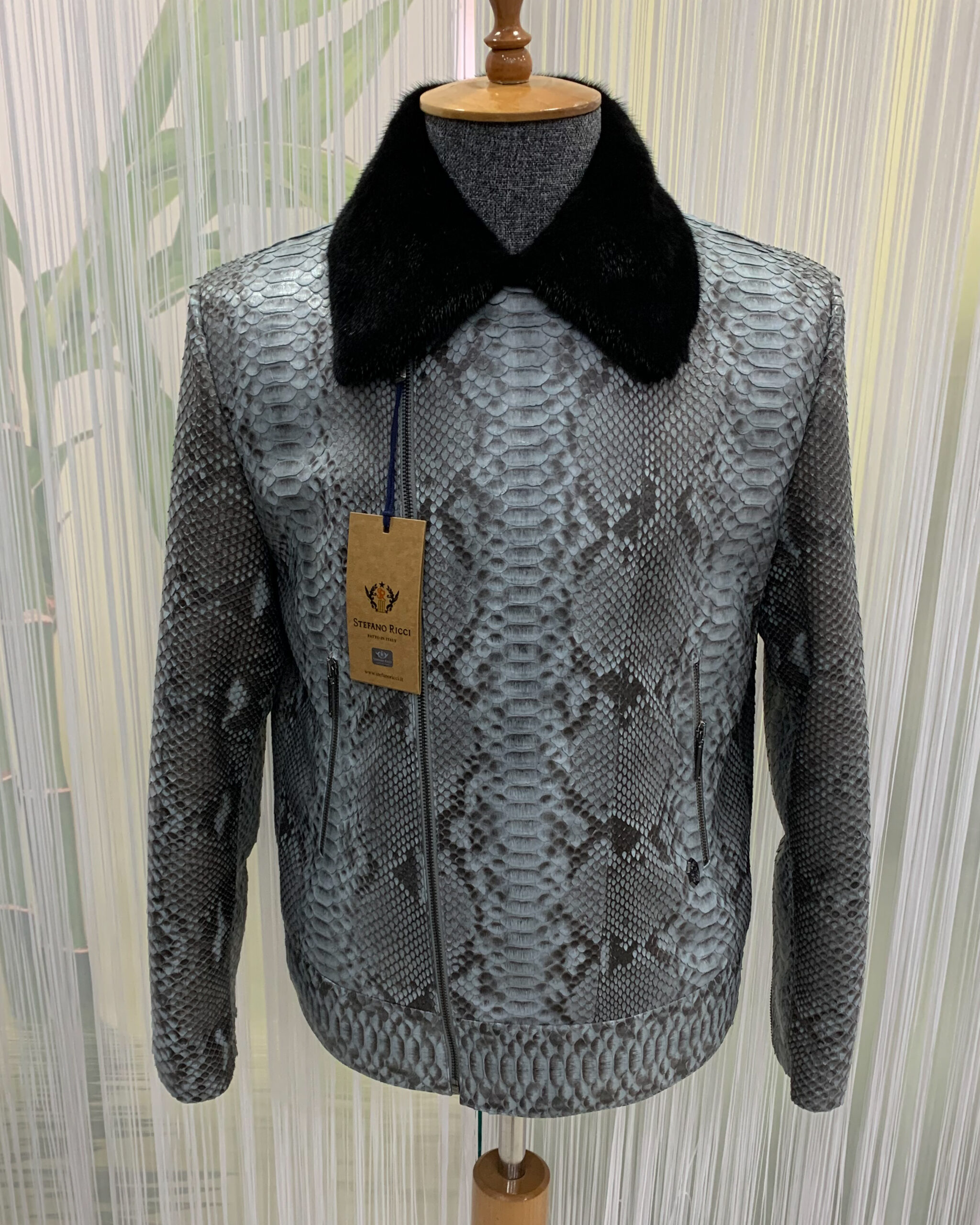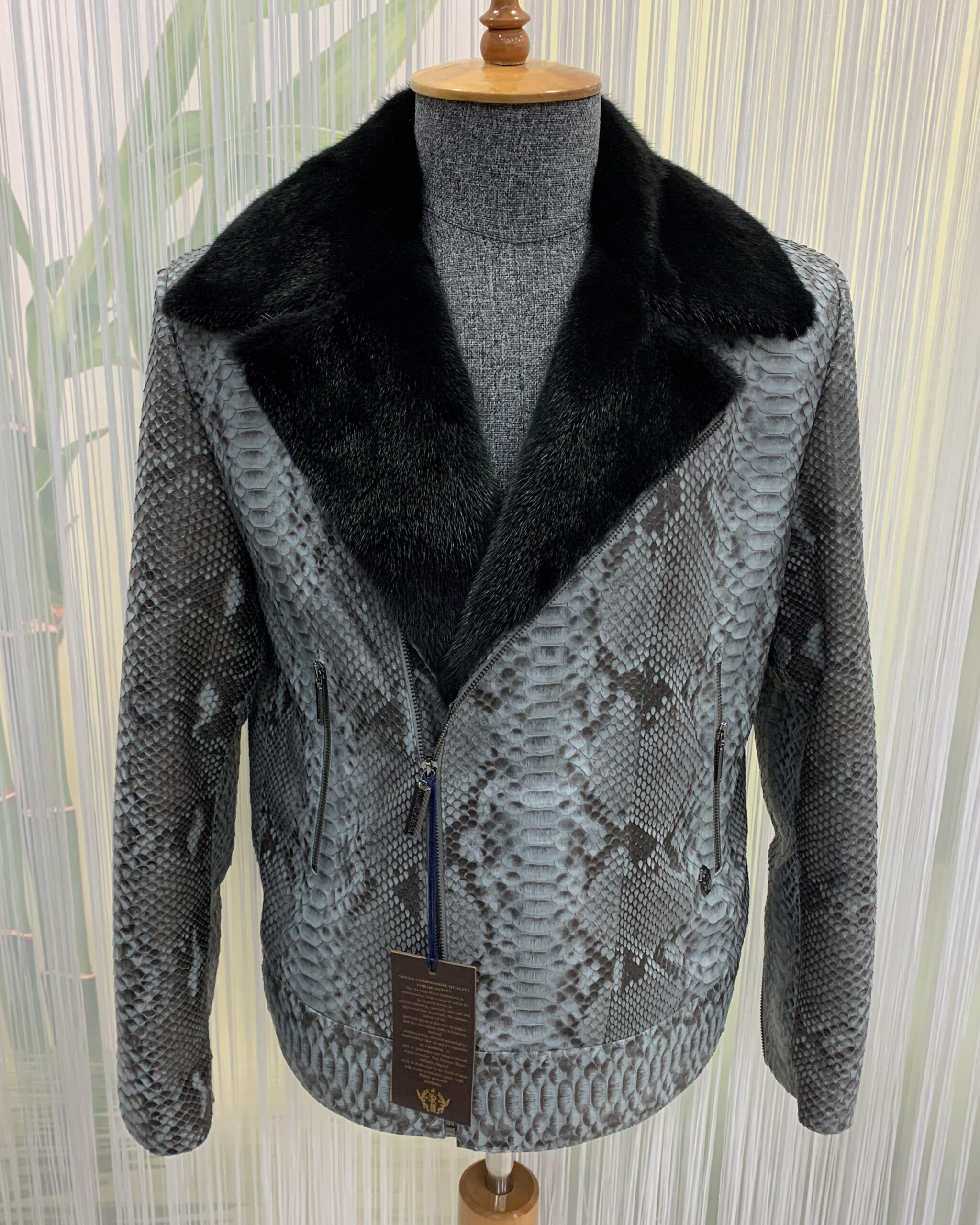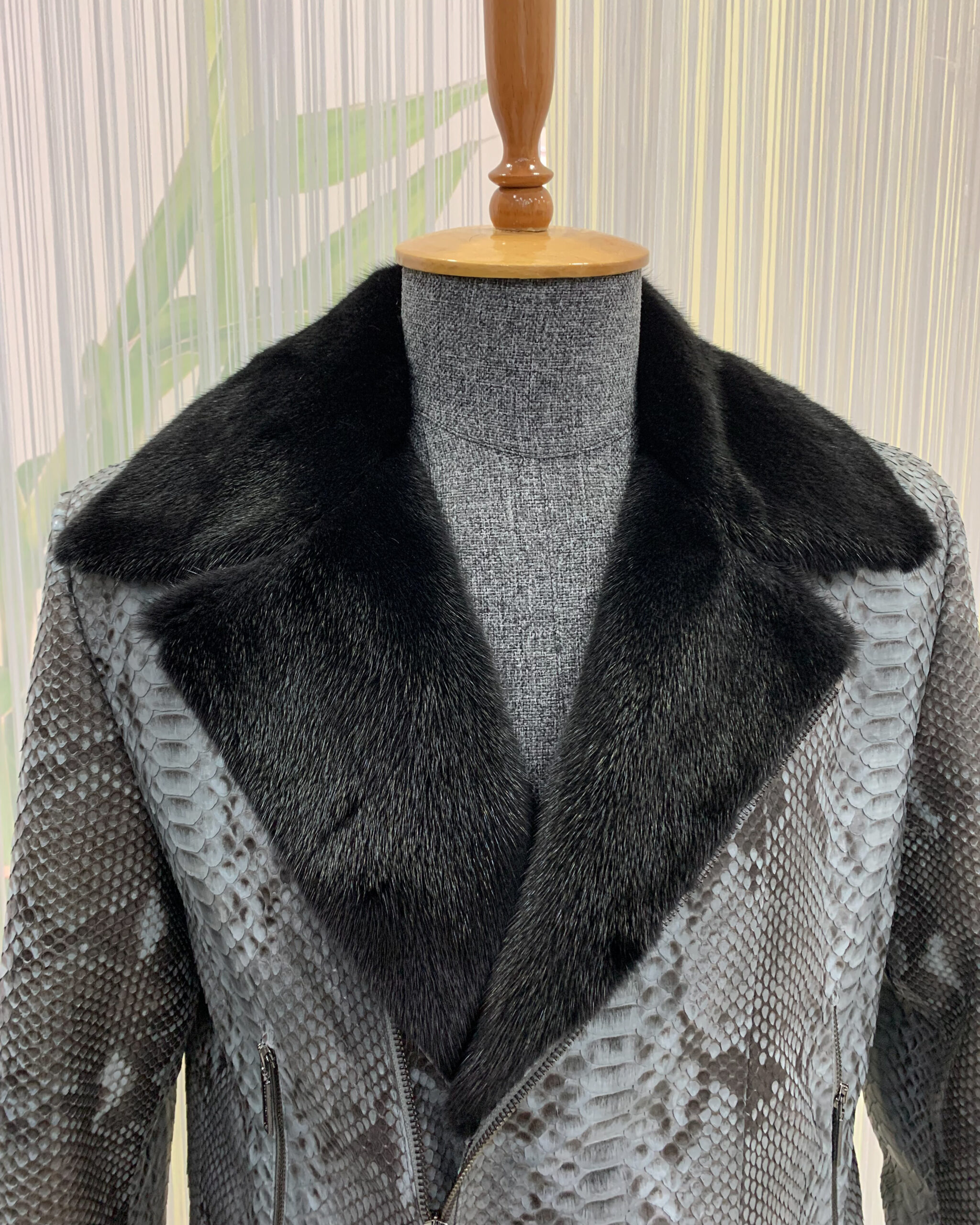 SR Python Skin Mink Fur Collar Grey Biker Jacket