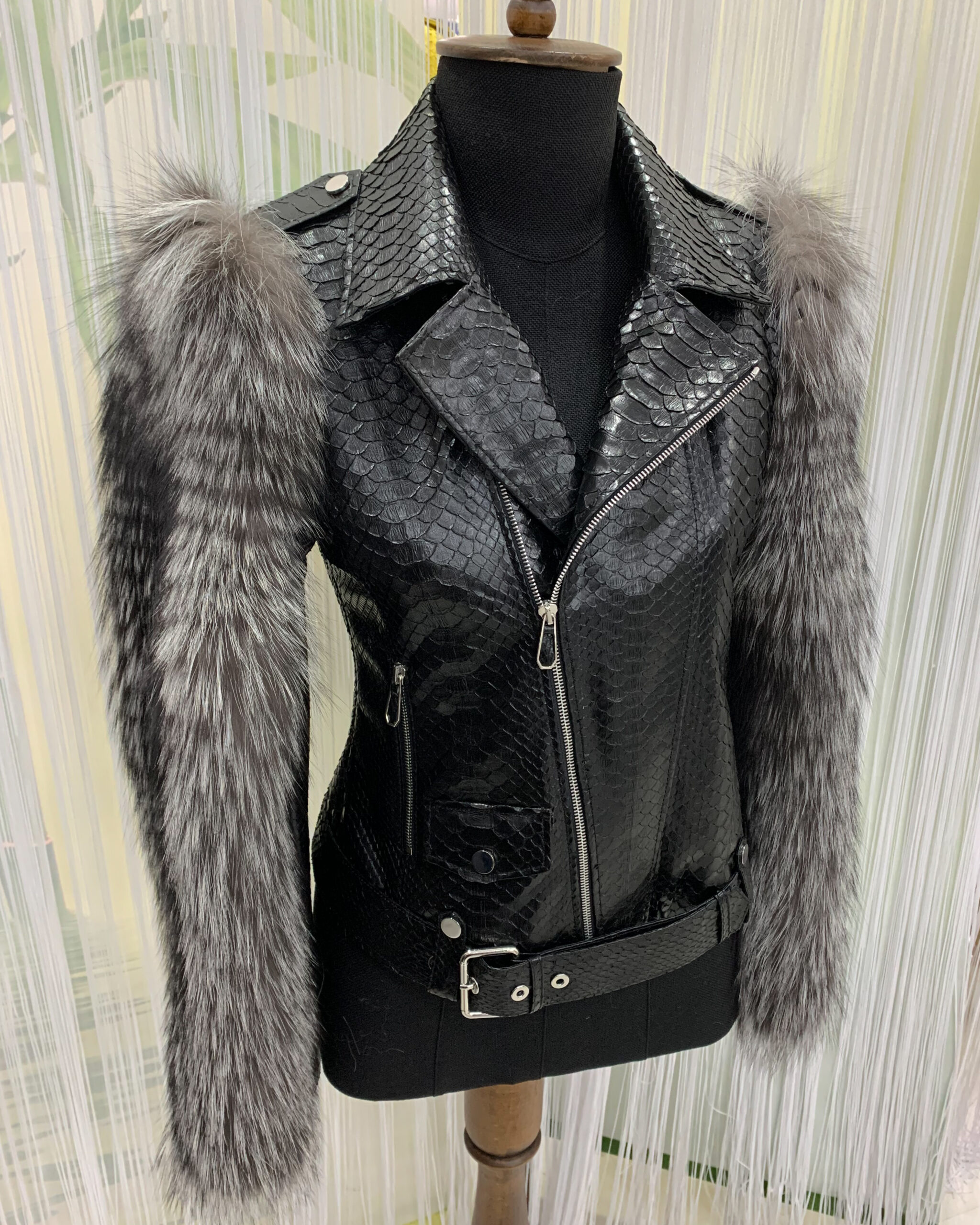 Womens Fox Fur Sleeves Python Leather Biker Jacket