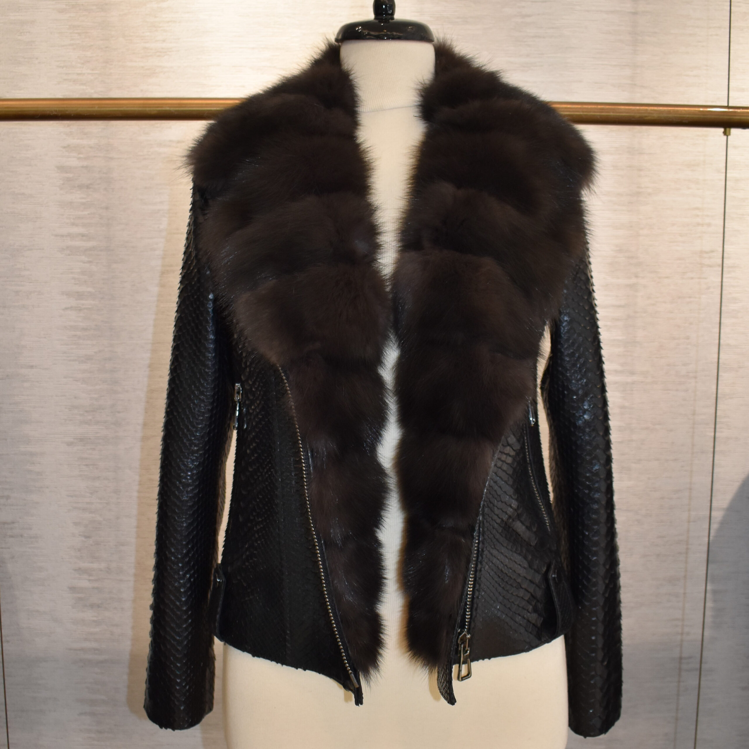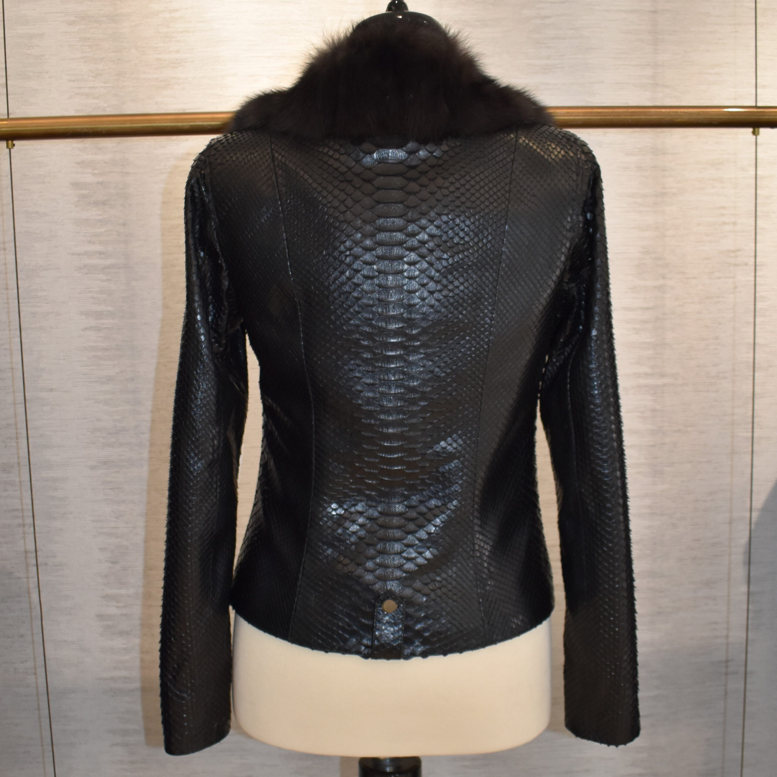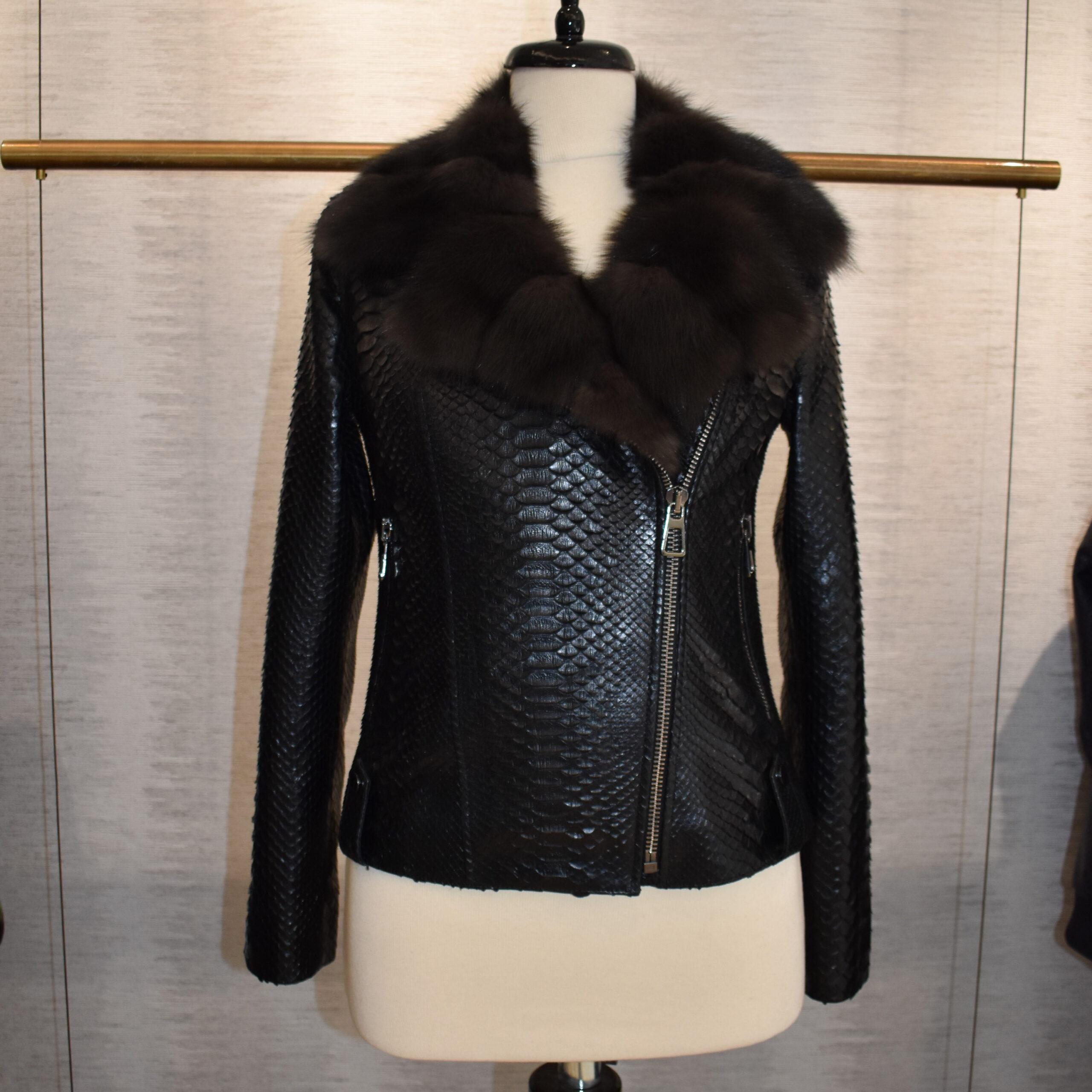 Womens Python Leather Biker Jacket With Sable Fur Trim